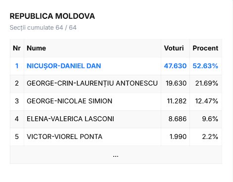 При этом, результаты голосования внутри Молдавии никакого действительно серьёзного преимущества бухарестскому еврокандидату дать не могли, как и любому другому, в силу а.) количества голосов; б.) разрыва в процентах после 1-го тура: националист Симион- 40,96%, "еврик" Дан- 20,99%.