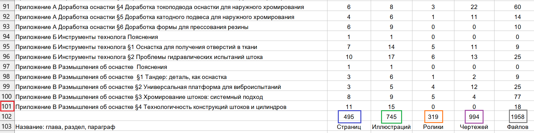 Всего в 11 Главах и трех Приложениях собраны 101 Параграф (красный прямоугольник) в 30-ти разделах. На почти 500 страницах (синий прямоугольник) размещены 745 иллюстраций (зеленый прямоугольник) и ссылки на 319 видеороликов (оранжевый прямоугольник). В архиве доступна документация (994 файлов, фиолетовый прямоугольник) на всю представленную оснастку. Для создания текста использовано почти 2000 файлов САПР (серый прямоугольник).