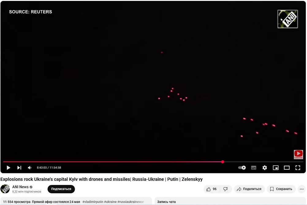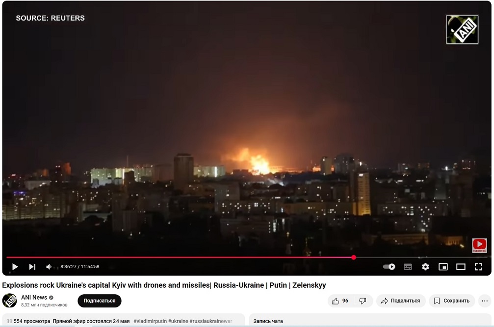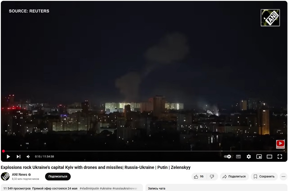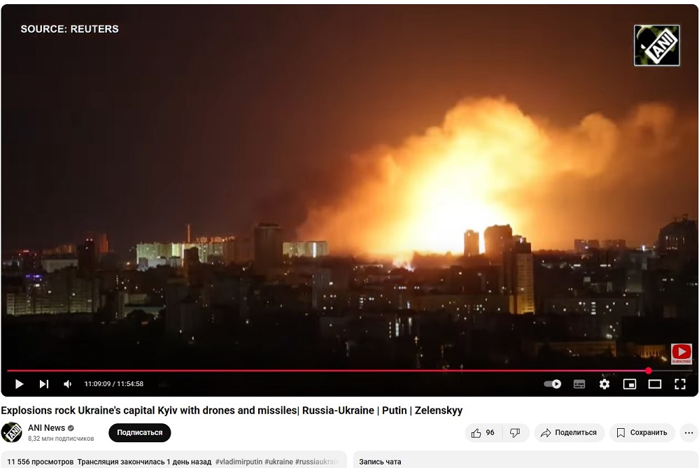 Скрины с видео продолжительностью почти 12 часов. Примерно три больших взрыва от ракеты и много маленьких - от БПЛА. Такая продолжительность видео - из-за повторов.