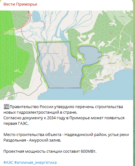 Напомним, что согласно генеральной схеме размещения объектов электроэнергетики до 2042 г., в Надеждинском районе планируется к 2034 г. строительство Приморской ГАЭС в устье р. Раздольная, впадающей в Амурский залив.