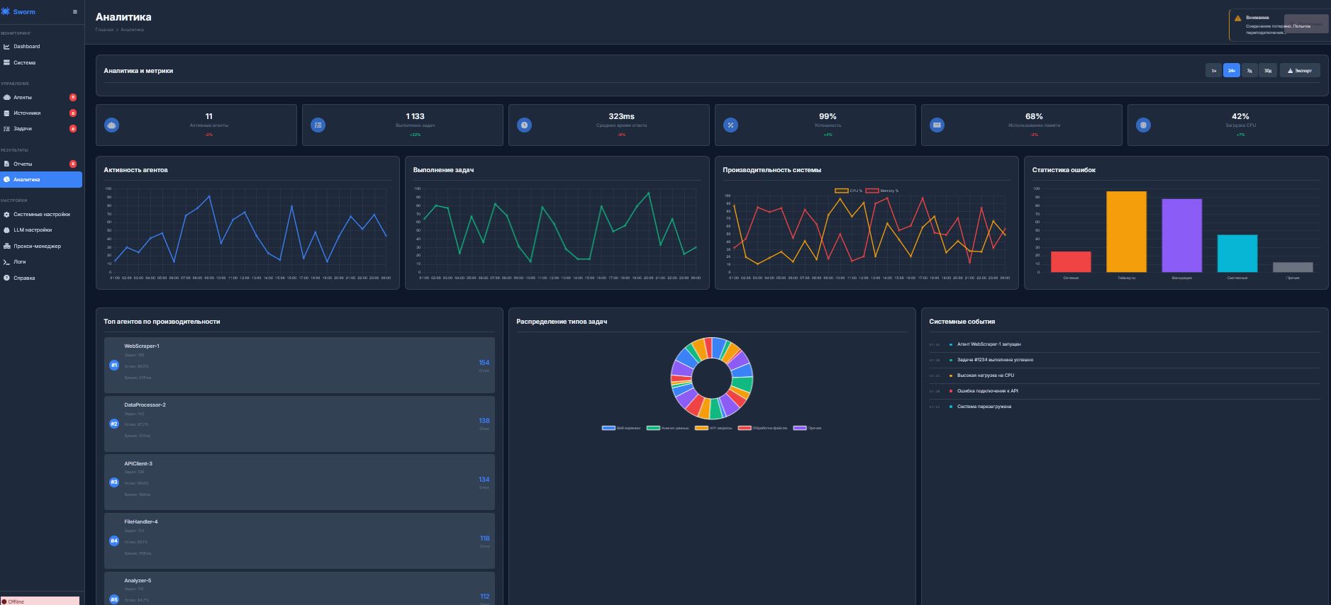 Графики нагрузки системы: занятость агентов, количество обработанных задач, время отклика LLM и т.д.