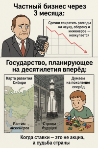 Государство как институт может и должно мыслить категориями десятилетий, ставя перед собой стратегические цели — от научно-технического лидерства до обороноспособности и демографического восстановления. Это контрастирует с логикой частного бизнеса, который, особенно в условиях капиталистического рынка, ориентирован на квартальную прибыль и стоимость акций.