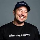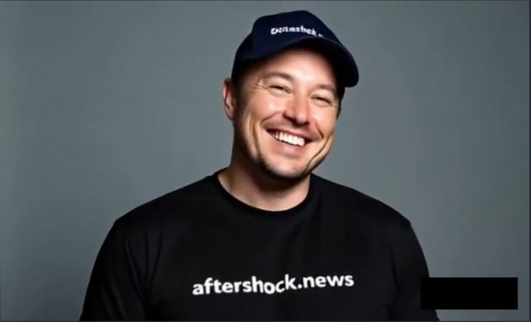 Илон Маск в футболке и бейсболке с надписями aftershock.news улыбается и произносит по-русски "Мне очень нравится aftershock.news".