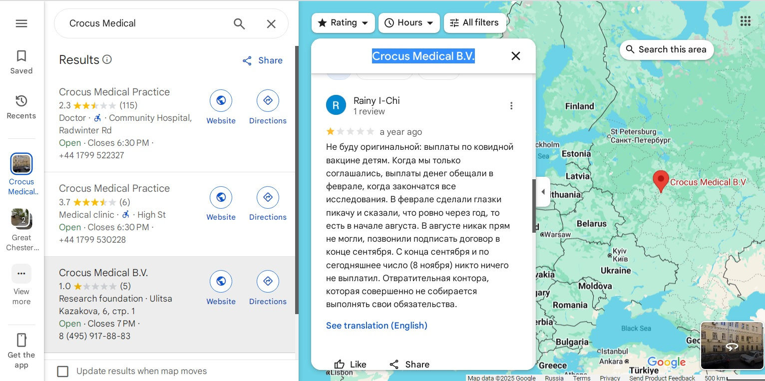 Забавные отзывы об этой организации можно найти на гугл картах по запросу «Crocus Medical». Людям не выплачивали деньги вовремя и прочее подобное.
