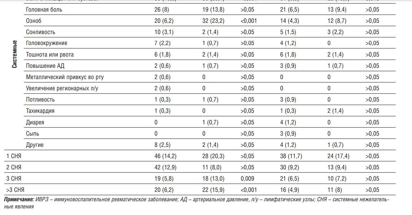 В таблице 2 у них указаны другие НЯ, которые можно перечислить здесь: субъективное сердцебиение (4 [5 %]), диарея (4 [5 %]), ринорея (4 [5 %]), потеря аппетита (3 [4 %]), отек (3 [4 %]), боль в ротоглотке (2 [2.5 %]), недомогание (2 [2.5 %]), боль в горле (2 [2.5 %]), крапивница (1 [1.3 %]), заложенность носа (1 [1.3 %]), кашель (1 [1.3 %]), чихание (1 [1.3 %]), зуд (1 [1.3 %]), припухлость (1 [1.3 %]).