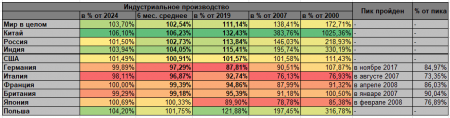 14. Текущий уровень индустриального производства по сравнению с 2000, 2007, 2019 и 2024 годом (первый и второй столбец отличаются тем, что в первом делается сравнение только последнего месяца с тем же месяцем год назад, а второй столбец берет 6-ти месячное среднее), а также когда был пройден пик производства, в тех странах, где он был пройден: