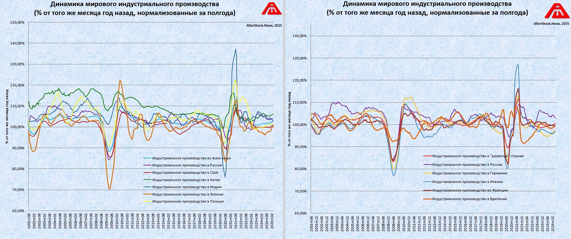 15. Индустриальное производство в процентах от того же месяца предыдущего года с нормализацией за полгода, Россия присутствует на обоих графиках для возможности сравнения: