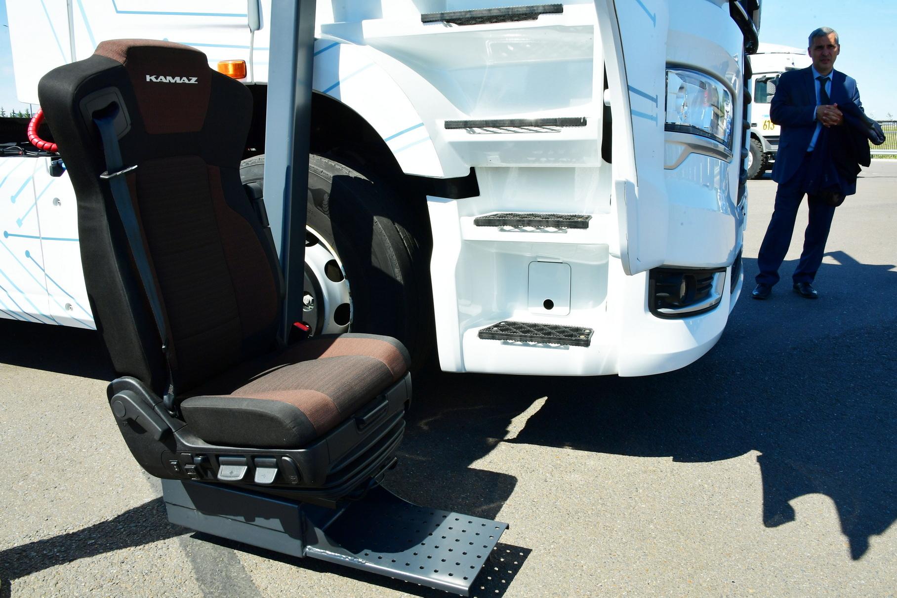 Основой послужил грузовик с автоматизированной коробкой передач, но педалей нет: управление реализовано на руле. Вопрос попадания в высокую кабину тягача КамАЗ решил с помощью специального устройства: из салона со стороны пассажира выдвигается балка с зафиксированным креслом. Управляется механизм с пульта, процесс занимает несколько секунд.