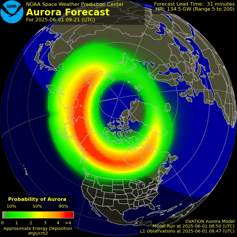Прогноз бури сместился, начало прогнозируется на 15:00 Мск. Уровни сразу "сильная буря", продолжительность до утра понедельника. На данный момент НАСА показывает HPI (мощность плазменного удара в атмосфере) для северного полушария 98 ГВт.
