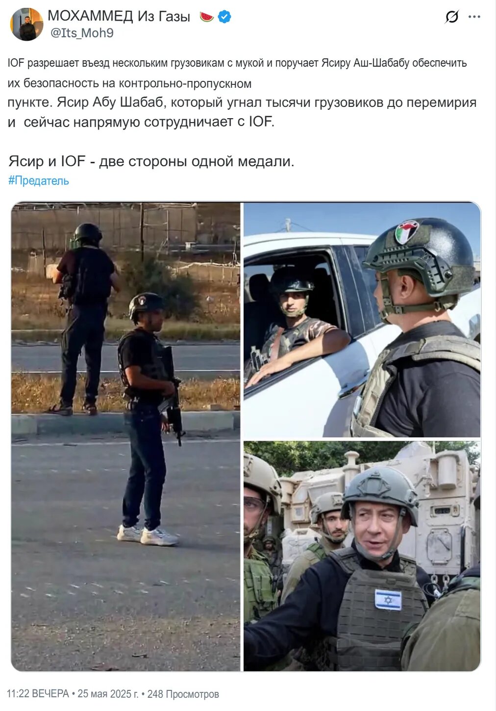 Шади аль-Софи, разыскиваемый убийца и сын информатора/сотрудника Израиля, и Яссер Абу Шабаб, торговец наркотиками, — главные полевые командиры, ответственные за разграбление большей части гуманитарной помощи под защитой ЦАХАЛ.