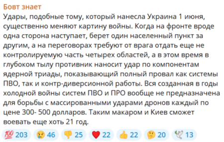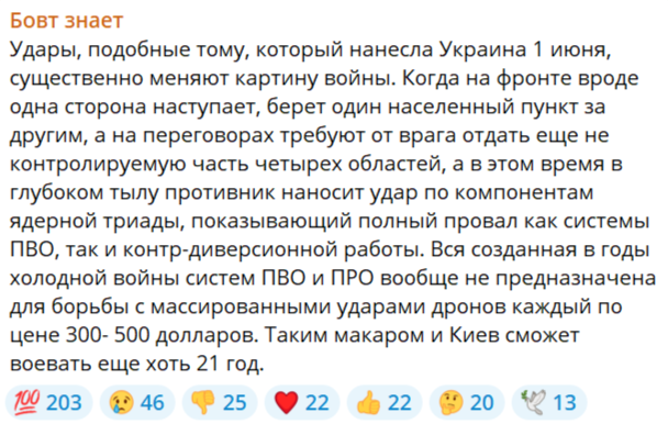 Сначала были украинские диверсии на ж/д, в результате которых погибли гражданские люди, в целях показать россиянам их уязвимость, а потом «яркая» диверсия на аэродромах, которая сбивает информационную волну жертв среди гражданских лиц в мировых СМИ.