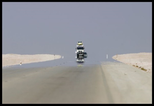 Если б на этом фото не было бы автовоза с его отражением от слоя нагретого воздуха, мы бы и не заметили бы никакой "лужи"-миража, а увидели бы небо и повисшие в воздухе куски пустыни.