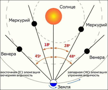 Меркурий, как и Венера, относится к нижним планетам – их орбиты лежат внутри орбиты Земли. Но его орбита, в отличие от Венеры, сильно прижата к Солнцу – её средний радиус ~0,38 а.е., поэтому наблюдателю существенно мешает солнечная засветка. Для наблюдения за нижними планетами из-за их близости к Солнцу наиболее благоприятны области орбит вблизи элонгаций – моменты, в которых угол планета-Земля-Солнце достигает очередного локального максимума, см. рис. ниже. Из-за значительного эксцентриситета, более 20%, афелий орбиты Меркурия в полтора раза больше перигелия lаф/lпер=(1+e)/(1-e), поэтому его угловое отклонение от направления на Солнце колеблется в разных элонгациях от 18° до 28°. У Венеры е всего 0,68%, поэтому диапазон угловых отклонений в элонгациях гораздо уже – от 45° до 48°:
