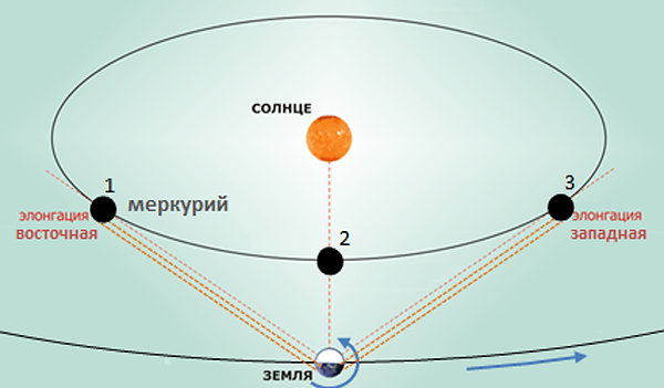 Нижние планеты демонстрируют себя в режиме либо вечерней, либо утренней звезды. Причина двойственной экспозиции станет понятна, если мысленно прокрутиться в качестве наблюдателя на поверхности Земли, когда Меркурий находится в точках 1 и 3 своей орбиты, см. рис. ниже.