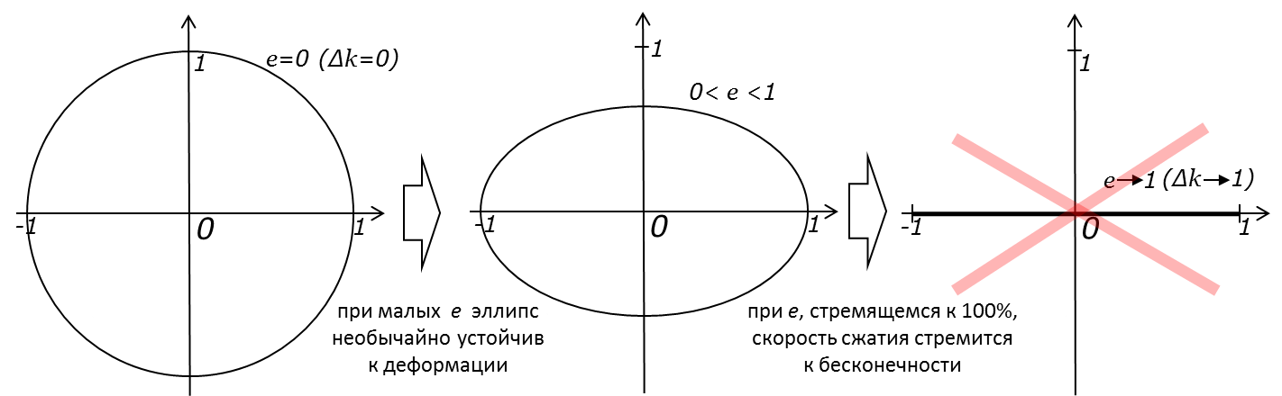 Исходная высокая устойчивость к сжатию с ростом эксцентриситета сменяется обрушением формы на конечной стадии деформации после прохождения точки (∆k~0,85; е~99%), область выделена на гр. серым. Скорость сжатия dk/de при приближении е к 1 стремится к бесконечности, а форма эллипса устремляется к отрезку [-1;1]. Предел недостижим не только математически, но и физически, поскольку расположенная в фокусе масса, имея конечный размер, пересечётся с траекторией небесного тела гораздо раньше:
