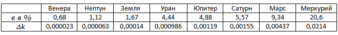 Параметры планетарных орбит сведены в таблицу в порядке возрастания эксцентриситета е, приведён в %. Тогда как отклонение ∆k представлено в действительных числах, дабы наглядно продемонстрировать его мизерность:
