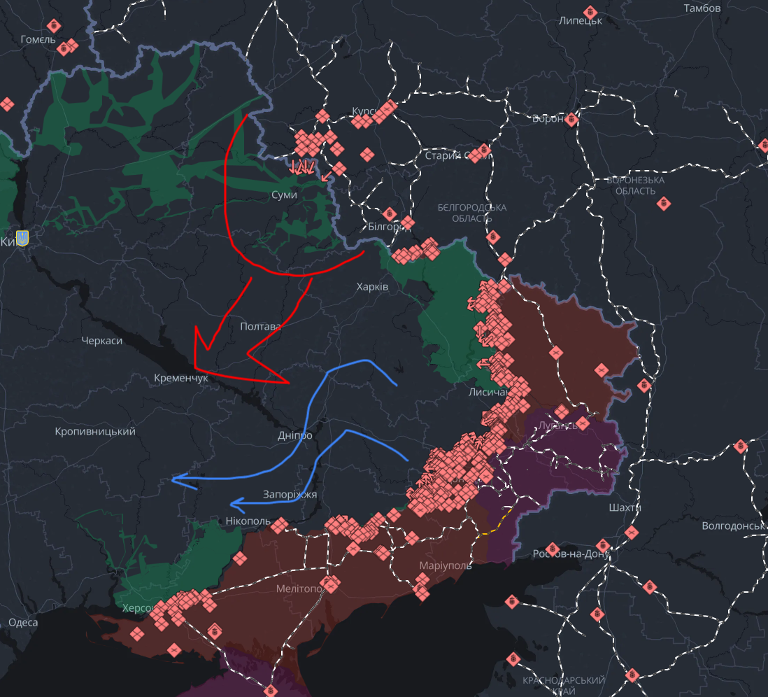 После взятия Сум и окрестностей дальнейшее движение к Днепру в направлении Полтава-Кременчуг. Это всего 250 км от границы б РСФСР и б. УССР. По достижении нами сего водного рубежа всю группировку укровойск придется эвакуировать на правый берег. Сделать это смогут не только лишь все, мало кто это сможет сделать.
