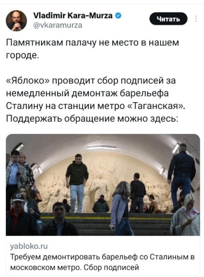 Мы, нижеподписавшиеся, поддерживаем заявление Бюро московского отделения партии «Яблоко» от 12 мая 2025 года и категорически выступаем за демонтаж барельефа с изображением Иосифа Сталина на станции метро «Таганская» в Москве.