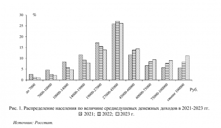 Уровень бедности в России в последние несколько лет снижается. Если в 2016 г. он составлял 13,5% населения, то в 2023 г. – уже 8,5%. Однако в целом следует сказать, что доходы населения нашей страны по-прежнему невелики. В 2023 г. 80% населения имели ежемесячный доход в размере 35,579 тыс. руб. и были сосредоточены в первых четырех 20- процентных доходных группах, тогда как в пятой группе, на которую в 2023 г. приходилось 46,4% суммарных доходов, ежемесячные доходы населения в среднем составляли 123,198 тыс. руб.