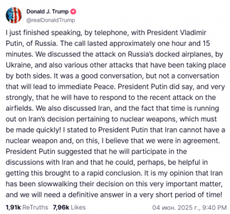 Я только что закончил телефонный разговор с президентом России Владимиром Путиным. Звонок длился примерно один час и 15 минут. Мы обсудили атаку на пришвартованные российские самолеты со стороны Украины, а также различные другие атаки, которые имели место с обеих сторон. Это был хороший разговор, но не разговор, который приведет к немедленному миру. Президент Путин сказал, и очень решительно, что ему придется отреагировать на недавнюю атаку на аэродромы. Мы также обсудили Иран и тот факт, что время на решение Ирана относительно ядерного оружия истекает, и это решение должно быть принято быстро! Я заявил президенту Путину, что у Ирана не может быть ядерного оружия, и в этом, я считаю, мы пришли к согласию. Президент Путин предложил, что он примет участие в обсуждениях с Ираном и что он, возможно, мог бы помочь в скорейшем завершении этого вопроса. По моему мнению, Иран медленно принимает решение по этому очень важному вопросу, и нам понадобится окончательный ответ в очень короткие сроки!