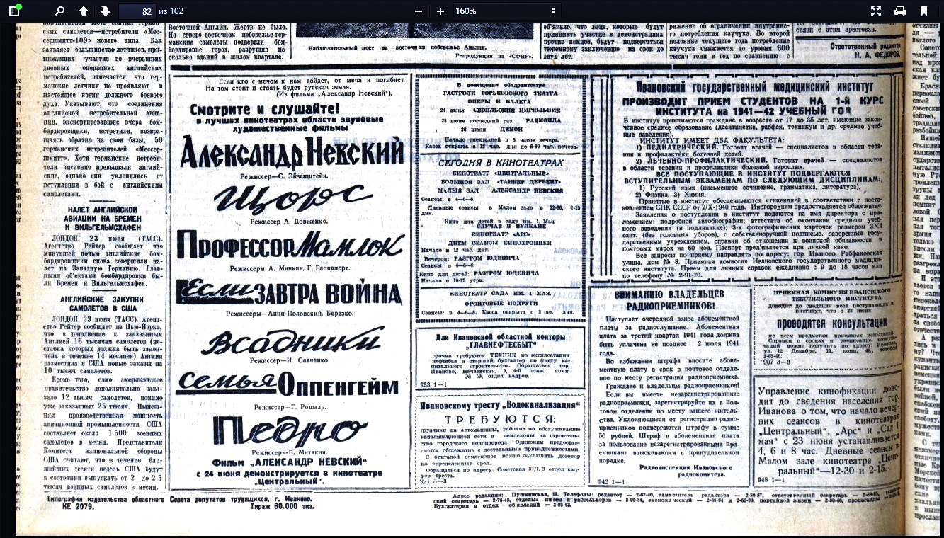 Что характерно: после нападения фашистов в июне 1941 г. поменяли репертуар кинотеатров: с 23-24 июня текущий репертуар стали заменять в целях развёртывания патриотической и антифашистской пропаганды.