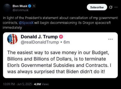 Да в целом всё укладывается в американскую логику и в её рамках претензии Маска непонятны: он бесплатно, в статусе специального госслужащего (SGE), помогал Трампу осуществлять сокращение расходов бюджета взамен на неприкосновенность своих контрактов на время своей работы на правительство. Бесплатно работаешь - можешь рассчитывать на некоторые послабления и плюшки. Теперь срок его полномочий, как специального госслужащего закончился, сейчас он в числе тех, кто создаёт нагрузку на бюджет и у Трампа больше нет обязательств эту неприкосновенность обеспечивать. А так как Маск с такой позицией не согласен, то намечается торг, который неизбежно приведёт к разделу куличиков в песочнице по новой схеме. Сейчас помахают языками и договорятся, как жить дальше.