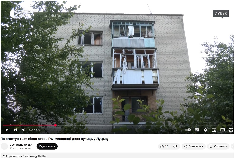 Луцк. Повреждены дома, многоквартирные в том числе. Повреждено в общей сложности около 2000 окон, 13 автобусов. Глава одного из ОСББ — «в домах нет ни одного целого окна».