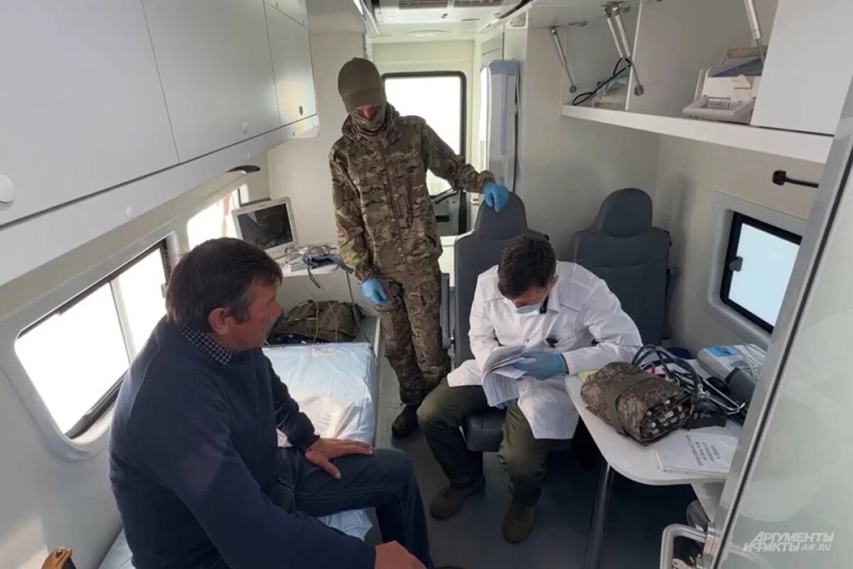 «Миф» (в белом халате) оказывает помощь гражданском населению Курской области. / Фото: Никита Сахаров / АиФ