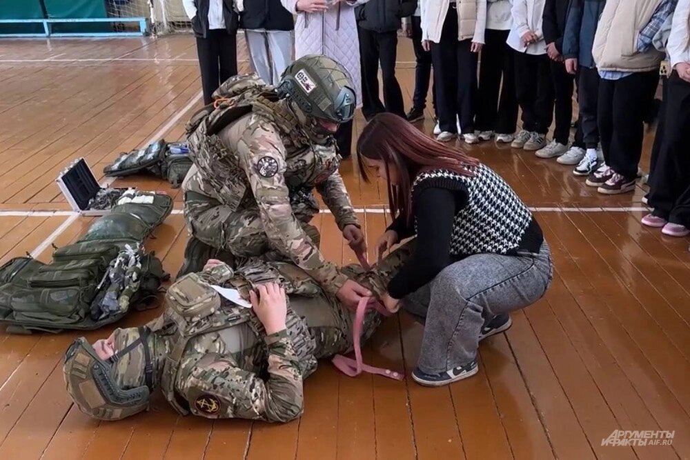 Миф (сидит слева) проводит занятие со школьниками по тактической медицине. Фото: АиФ/ Никита Сахаров
