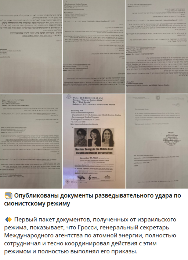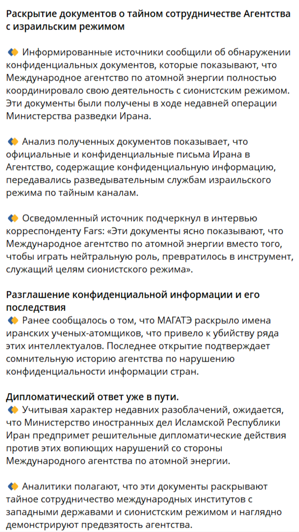 🔹 Анализ полученных документов показывает, что официальные и конфиденциальные письма Ирана в Агентство, содержащие конфиденциальную информацию, передавались разведывательным службам израильского режима по тайным каналам.