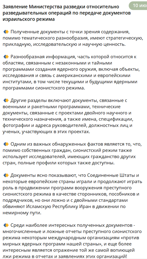Заявление Министерства разведки Ирана относительно разведывательных операций по получению документов израильского режима: