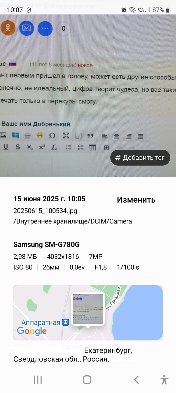 Скрин экрана смартфона с фото и геометкой моего коммента .