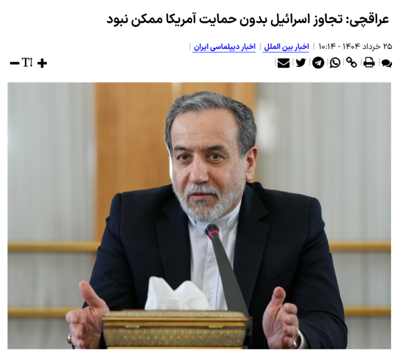 В течение последних двух дней мы получали по различным каналам сообщения от США о том, что США не вмешиваются, но мы не верим этому утверждению. Если у них есть такие намеренья, они должны заявить об этом открыто. Частных сообщений недостаточно. США должны объявить свою точную позицию и осудить удары по ядерным объектам. Мы ожидаем, что США выйдут из этого конфликта. Я надеюсь, что международное сообщество обратит на это достаточно внимания и выступит против израильской агрессии. Это лучший способ установить мир в регионе.