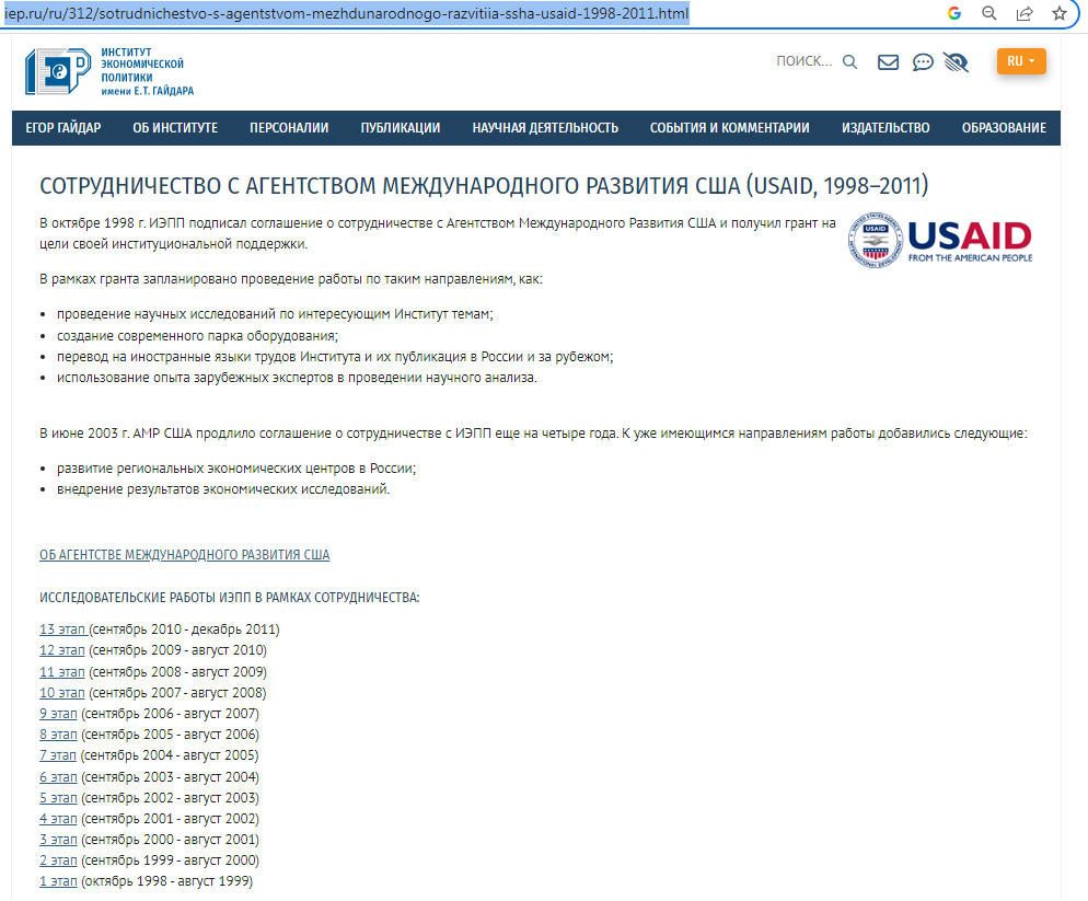 Этапы имели свои ссылки, но затем были потерты т.к. в 2012 году USAID в России запретили, потому, что агенство влияло на "... политические процессы, включая выборы различного уровня, и институты гражданского общества. Серьезные вопросы вызывала активность AMP в российских регионах, особенно на Северном Кавказе, о чем мы неоднократно предупреждали наших американских коллег", - говорилось в заявлении МИД РФ. А институт им. Гайдара сотрудничал. Впрочем и сам Гайдар имел очень прочные и давние связи с американцами начиная с его учебы и работы в стенах Стнэнфорда. Он пробыл шесть месяцев в качестве научного сотрудника в Гуверовском институте, родном доме экономистов из администрации Рейгана. Об этом написано в книге "Collapse. The Fall of the Soviet Union. By Vladislav M. Zubok.
