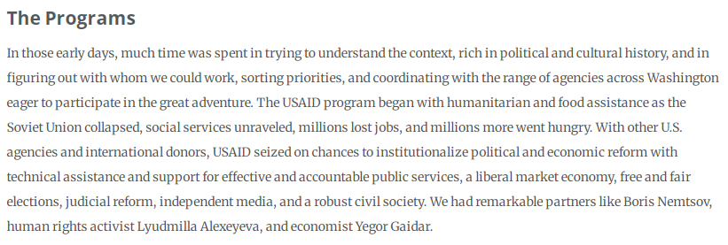 Референт, а затем директор миссии USAID в России Дезе Майерс писал: У нас были замечательные партнеры, такие как Борис Немцов, активистка по правам человека Людмила Алексеева и экономист Егор Гайдар.