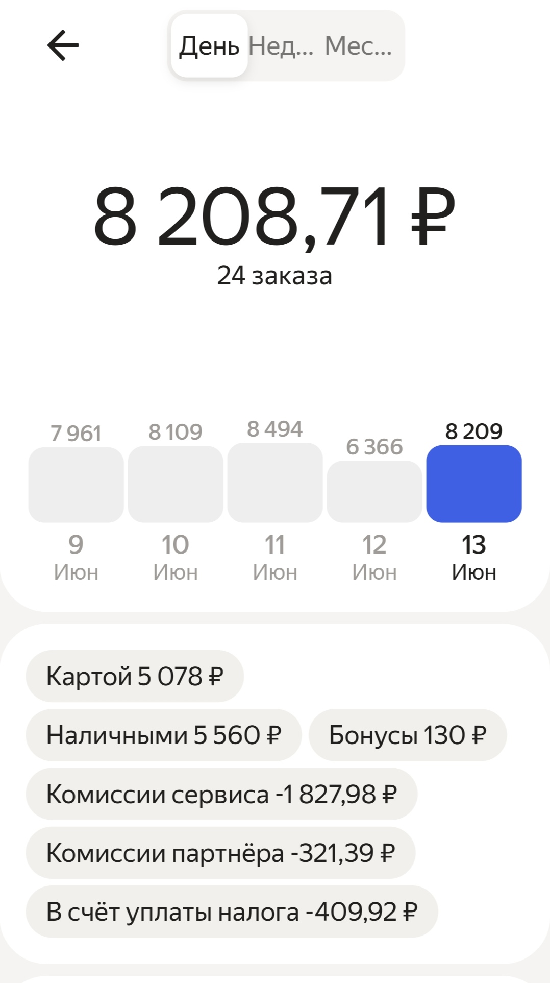5 Итого... Сумма сверху скрина это доход за вычетом комиссии агрегатора, таксопарка, налога по самозанятости (расшифровку вы там видите). Соответственно за минусом моей затратной части в 3000,0 руб., на руки в смену остается в среднем 5000,0 руб. Дни бывают разные - когда больше когда меньше (при моем графике работы), но в среднем все выглядит именно так... Плотно работаю пять дней (понедельник-пятница), субота я уже совсем не живой, поэтому короткий день... 2000,0-3000,0 руб, как пойдет.