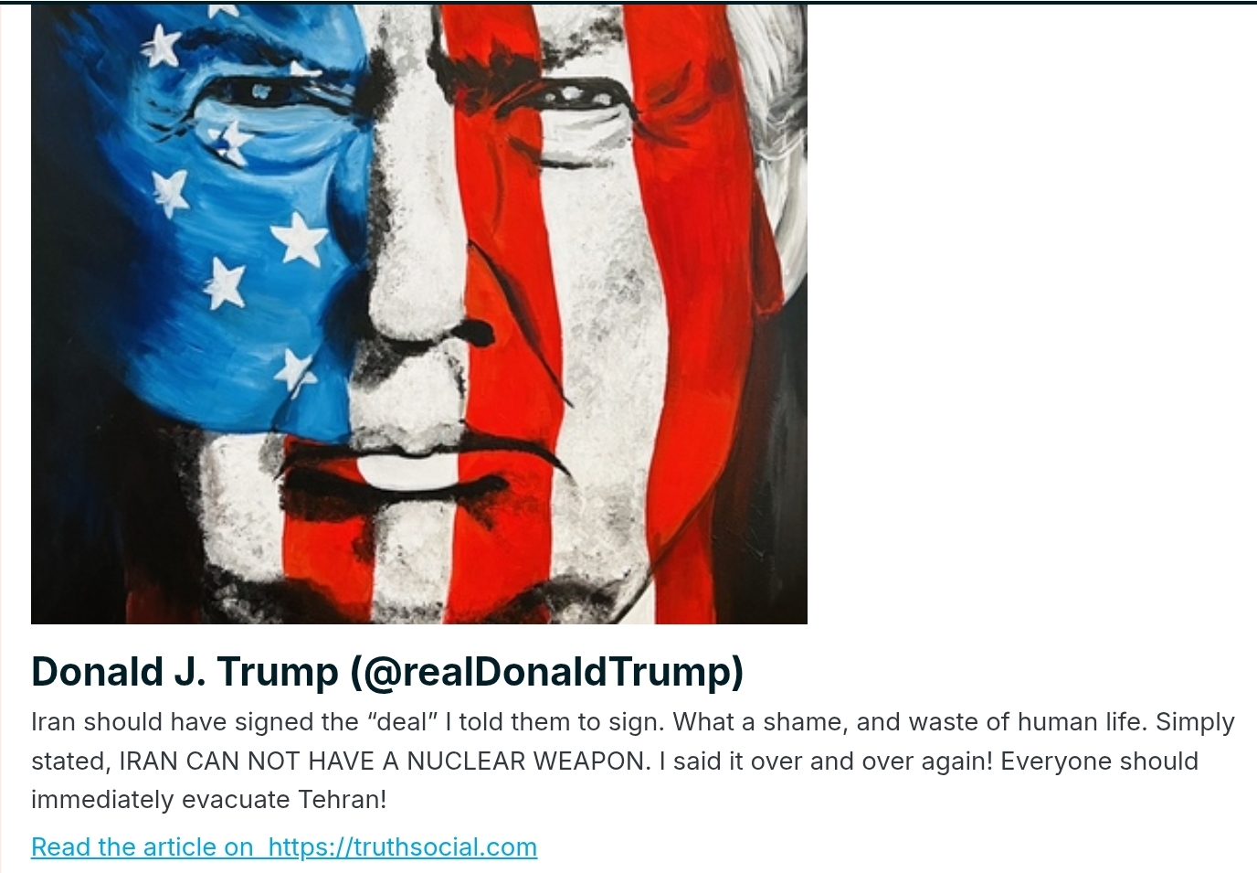 "Всем следует немедленно покинуть Тегеран!" - написал он на своей социальной платформе Truth.