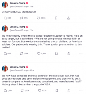 Президент США Дональд Трамп разбушевался в своей социальной сети по поводу Ирана, требует капитуляции.