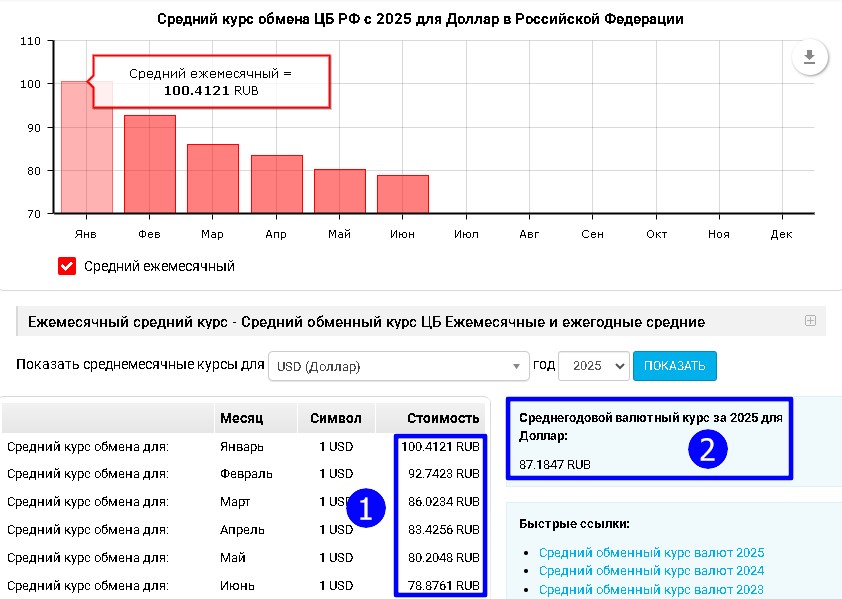 Складываем вместе все месячные показатели(1) и разделив их на 6 месяцев - получаем средний курс рубля к доллару на текущий момент(2).