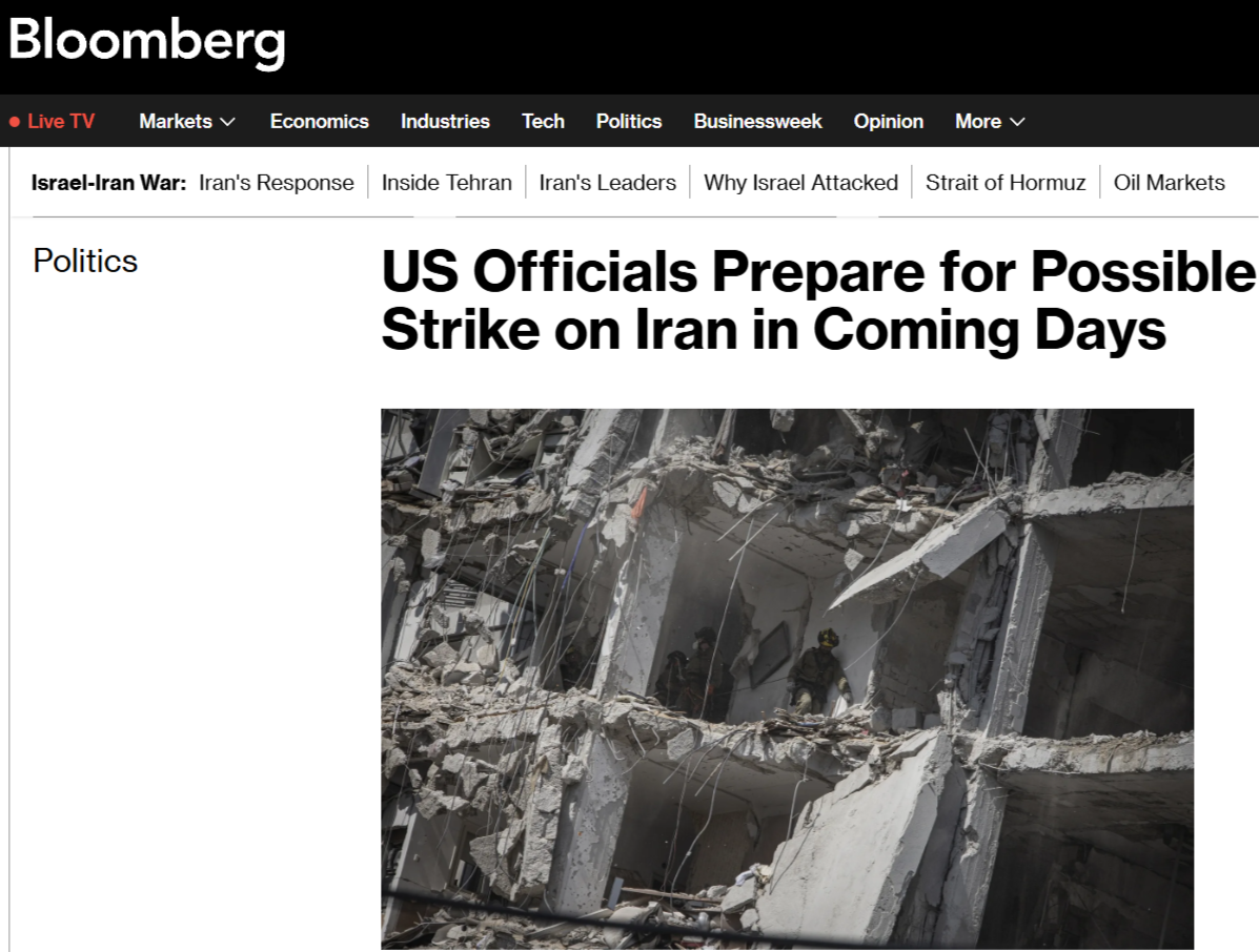 19 июня Bloomberg: По словам людей, знакомых с этим вопросом, высокопоставленные американские чиновники готовятся к возможному удару по Ирану в ближайшие дни, что является признаком того, что Вашингтон собирает инфраструктуру для прямого вступления в конфликт с Тегераном.
