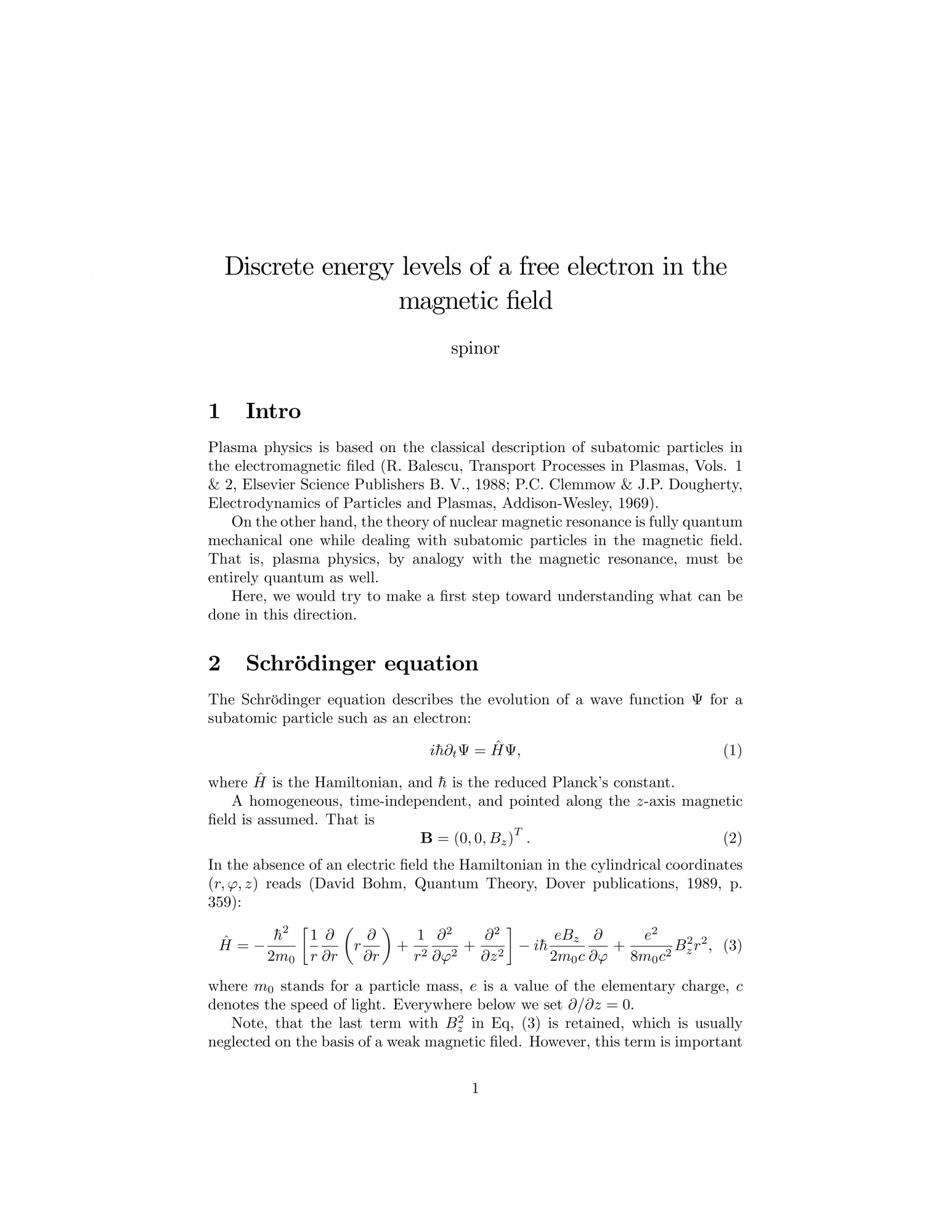 Рассмотрим простенькую задачку, но которой будет вполне достаточно для объяснения высоко-атмосферного электромагнитного импульса. Направим постоянное однородное (локально) магнитное поле вдоль оси z и введём цилиндрическую систему координат (r,ϕ,z). И решим уравнение Шрёдингера для свободного электрона. Гамильтониан известен. Однако, как правило в Гамильтониане отбрасывается квадратичный член, содержащий плотность энергии магнитного поля B2. При этом говорится, что он маленький (член этот) и поэтому не нужен. Но мы этого делать не будем на основании того, что "мал клоп, да вонюч". Он важен и даже очень. Квадратичный член содержит также и квадрат радиуса r2, что уже напоминает уравнение для гармонического осциллятора.