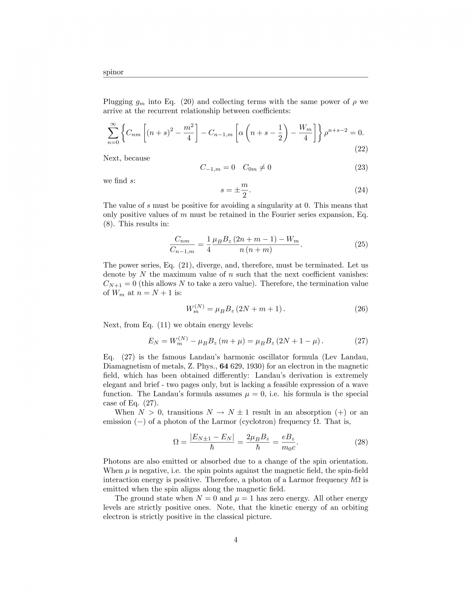 И это имеет смысл, устраняя парадокс циклотронного излучения! Таким образом, электрон переходя с одного энергетического уровня на другой из-за пертурбаций магнитного поля или по другим причинам испускает или поглощает кванты с Ларморовской частотой: соседние уровни дают E = ℏΩ, где Ω - Ларморовская частота. Присутствуют так же и кратные частоты nℏΩ.
