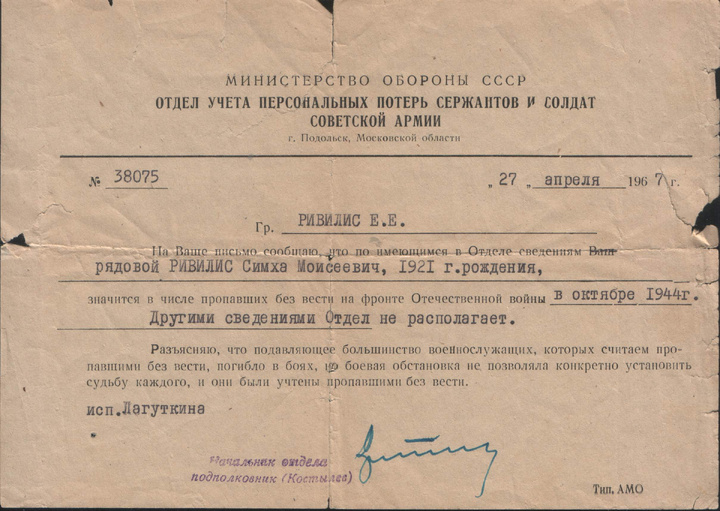 «Случайно в интернете мне попалась ваша статья о найденной в Калининграде медали Семёна Моисеевича Ривилиса, – написала врач из Тирасполя Инна Ривилис. – Так звали моего отца. Правда, он вернулся с войны. Однако до сих пор ничего не знаем об одном из двух его братьев, Симхе Моисеевиче. Может, речь о нём? Последнее письмо от Симы пришло в 1943 году из-под Харькова…»