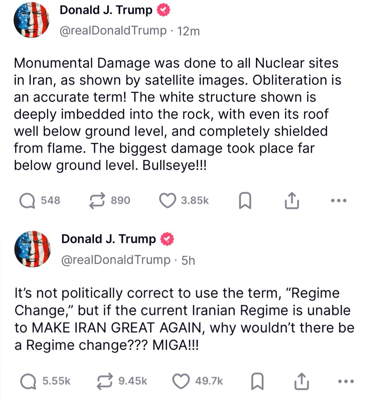 Колоссальный ущерб был нанесен всем ядерным объектам в Иране, как показывают спутниковые снимки. Уничтожение — точный термин! Самый большой ущерб был нанесен намного ниже уровня земли. В яблочко!!!