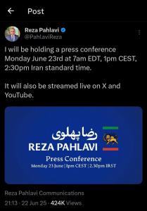 P.S.: "Его Королевское Высочество Реза Пехлеви, наследный принц Ирана и сын шаха Ирана Мохаммеда Резы Пехлеви, отстранённого от власти в 1979 году, объявил, что он проведёт пресс-конференцию в понедельник, 23 июня, в 13:00 по центральноевропейскому летнему времени (15.00 мск)"