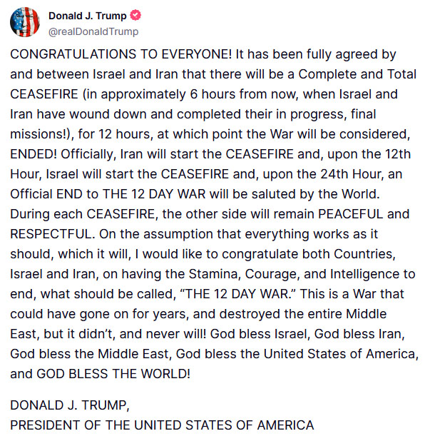 «Поздравляю всех! Израиль и Иран полностью согласовали полное прекращение огня...», — говорится в сообщении.