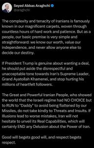 ◾️Если Трамп хочет заключить соглашение, ему следует отказаться от неуважительного и неприемлемого тона в отношении Верховного лидера, великого аятоллы Сейеда Али Хаменеи, и не оскорблять сердца миллионов его верных последователей.
