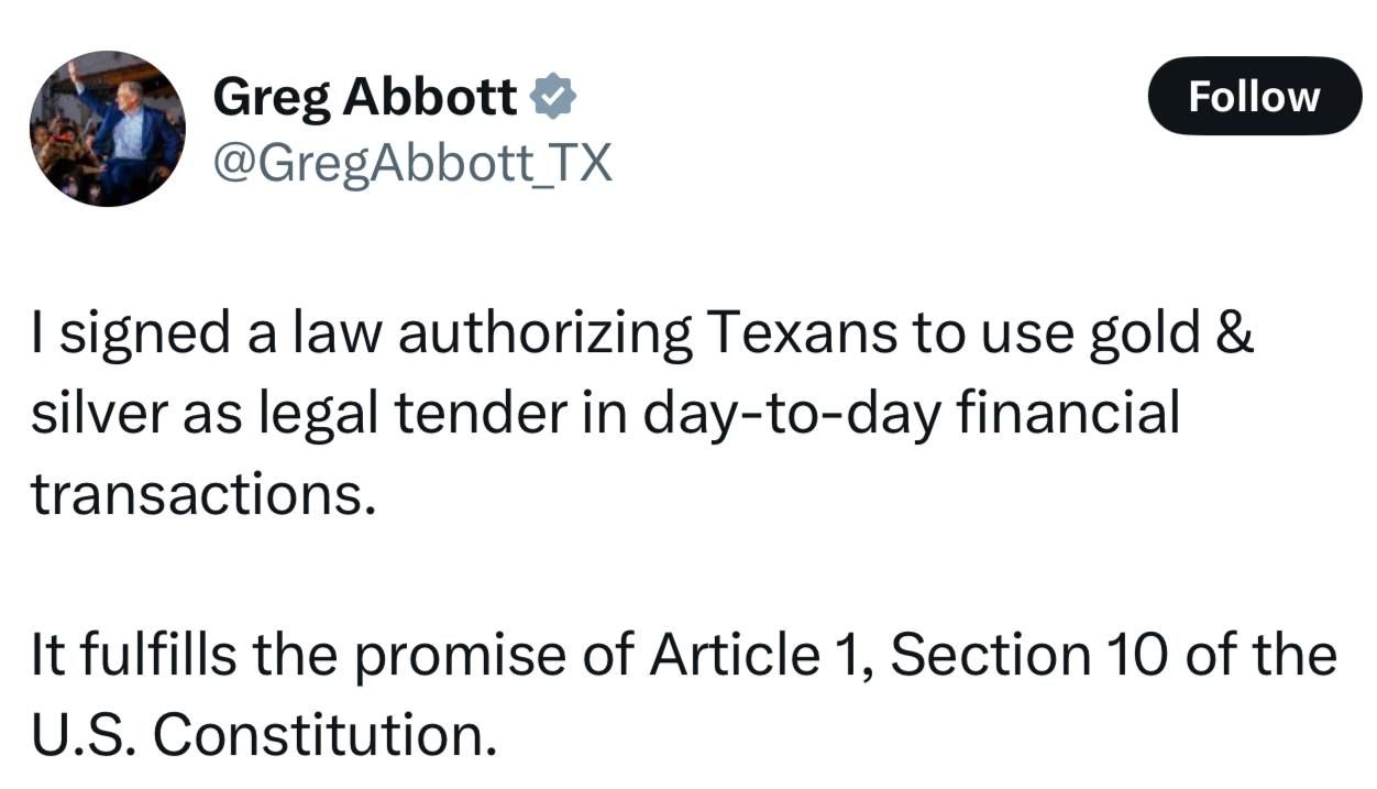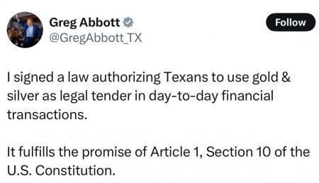 Губернатор Техаса Эббот – разрешил жителям штата расплачиваться золотом даже в магазинах: