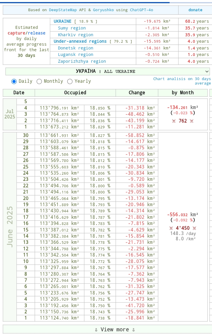 По данным укронацистских картографических сервисов проукраинивание территории б.УССР в среднем за последний месяц шло темпом около 20 кв км в день, но с начала июля 35 кв км.