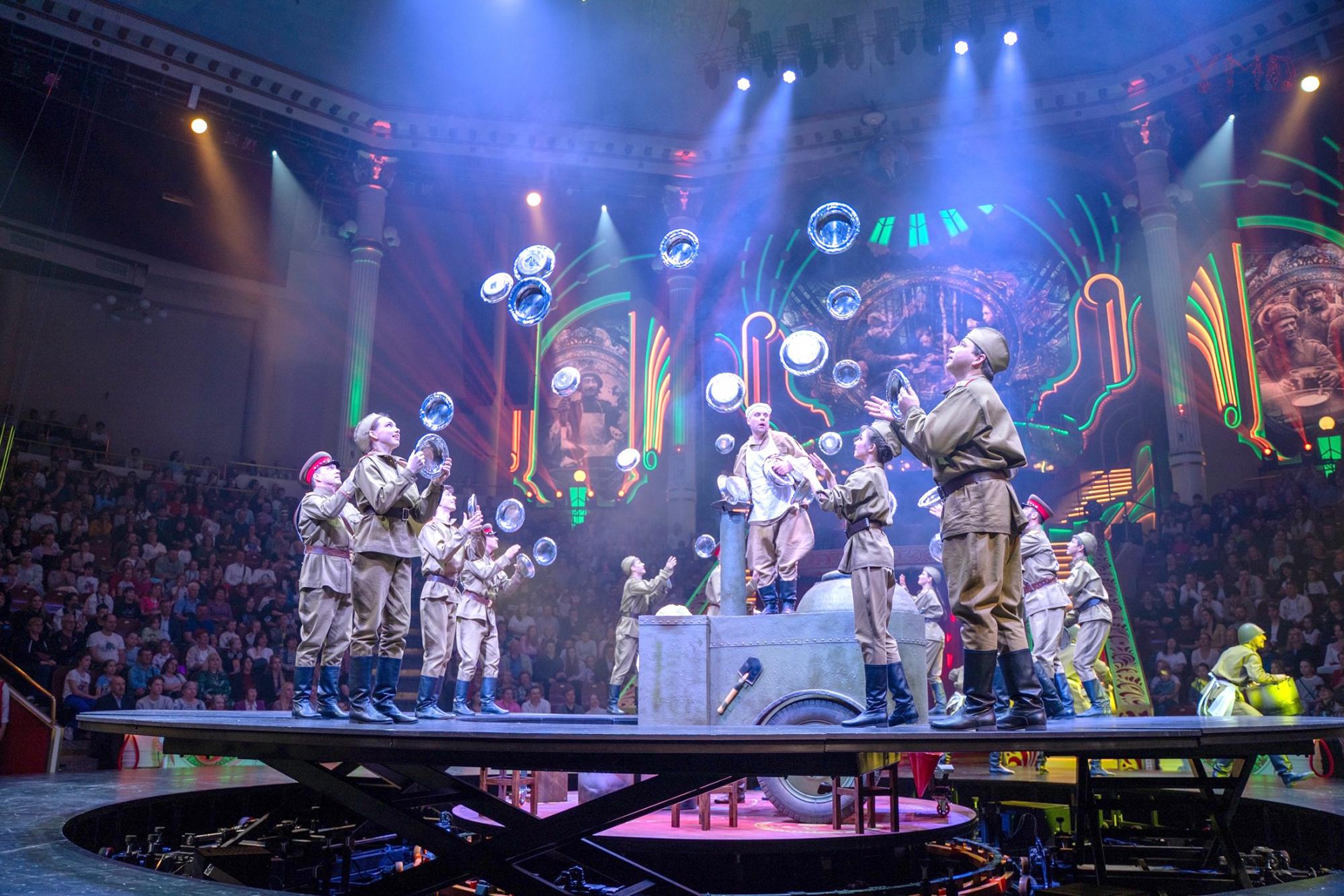 В Старом цирке Никулина на Цветном бульваре - аншлаг. Новая программа под названием "Музыка Победы" посвящена 80-летию Победы в Великой Отечественной войне. Шоу представляет собой сочетание музыки, акробатики и театра, погружающее зрителей в атмосферу триумфа и радости послевоенной эпохи.